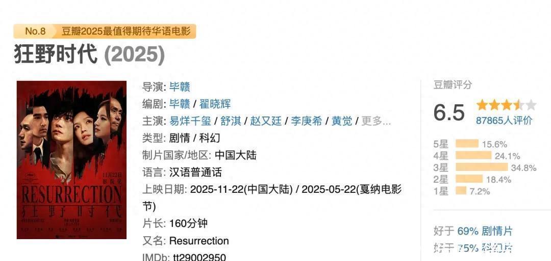 长期下来,艺术电影处境挺尴尬。导演耗时拍摄,观众却不买账,觉得晦涩难懂没法共情。片方不反思,反倒抱怨观众 “看不懂”,结果就是艺术电影和观众越来越脱节。但 “看不懂” 绝对不能成为拍烂片的借口! 查了下导演毕赣,之前拍过《路边的野餐》《地球最后的夜晚》,也算是有经验的导演。后者大家肯定有印象,当年跨年夜靠着 “定情一吻” 的宣传,首日骗走 2.6 亿票房,第二天就票房暴跌,和《狂野时代》如出一辙。看来这位导演拍电影的实力一般,炒作圈钱的本事倒是一流!